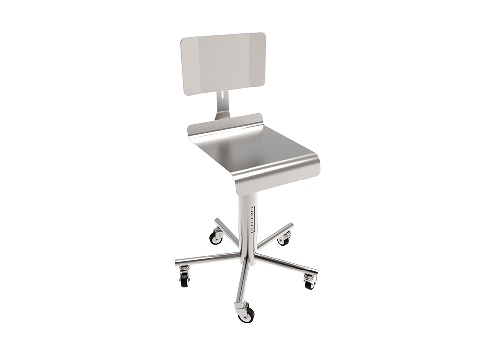 Entirely manufactured in stainless steel AISI 304. Seat dim. 380x400mm, adjustable in height between 500 and 600mm. Backrest easily adjustable without tools. Supporting base with 5 rays. Castors Ø60mm on stainless steel frame. Completely dismountable for sterilization in autoclave.