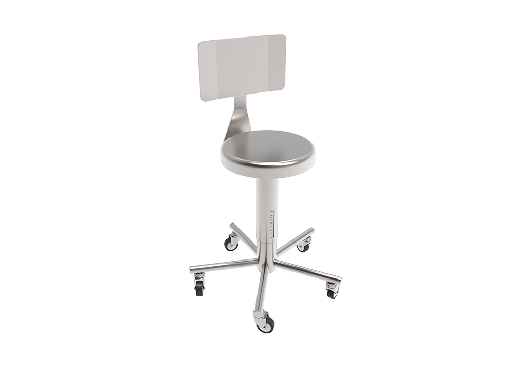 Entirely manufactured in stainless steel AISI 304. Seat Ø330mm, adjustable in height between 500 and 600mm. Backrest easily adjustable without tools. Supporting base with 5 rays. Castors Ø60mm on stainless steel frame. Completely dismountable for sterilization in autoclave.