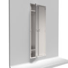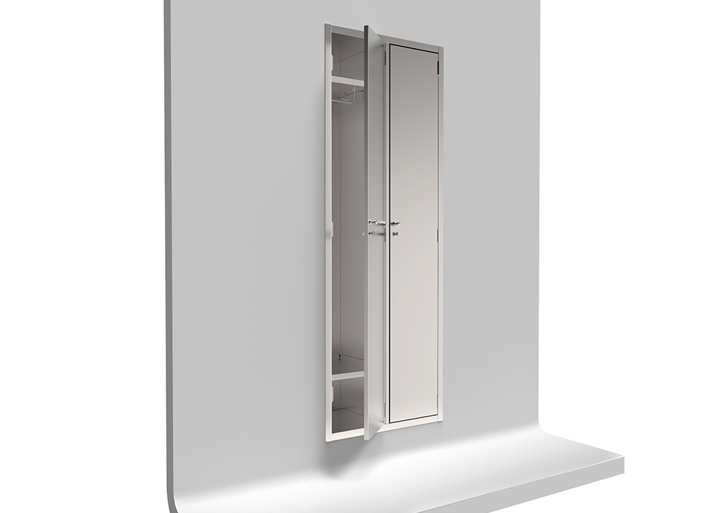 Wardrobe cabinet manufactured in AISI 304 with inner and outer scotch brite finish. Prepared for wall-recessed mounting, with doors profile leveled with the wall. Hinged door mounted on removable hinges, equipped with key lock. Each compartment is equipped with 1 upper shelf with hanging rod and 1 lower shelf, both adjustable in height.