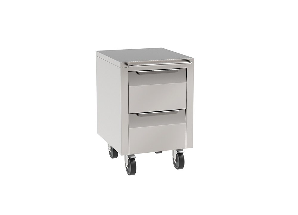 Full extraction drawers mounted on stainless steel rails. Upper top with sandwich structure, with front grip in stainless steel round wire. On 2 swivels and 2 braked anti-trace castors, diam. 125mm, and with stainless steel frame.
