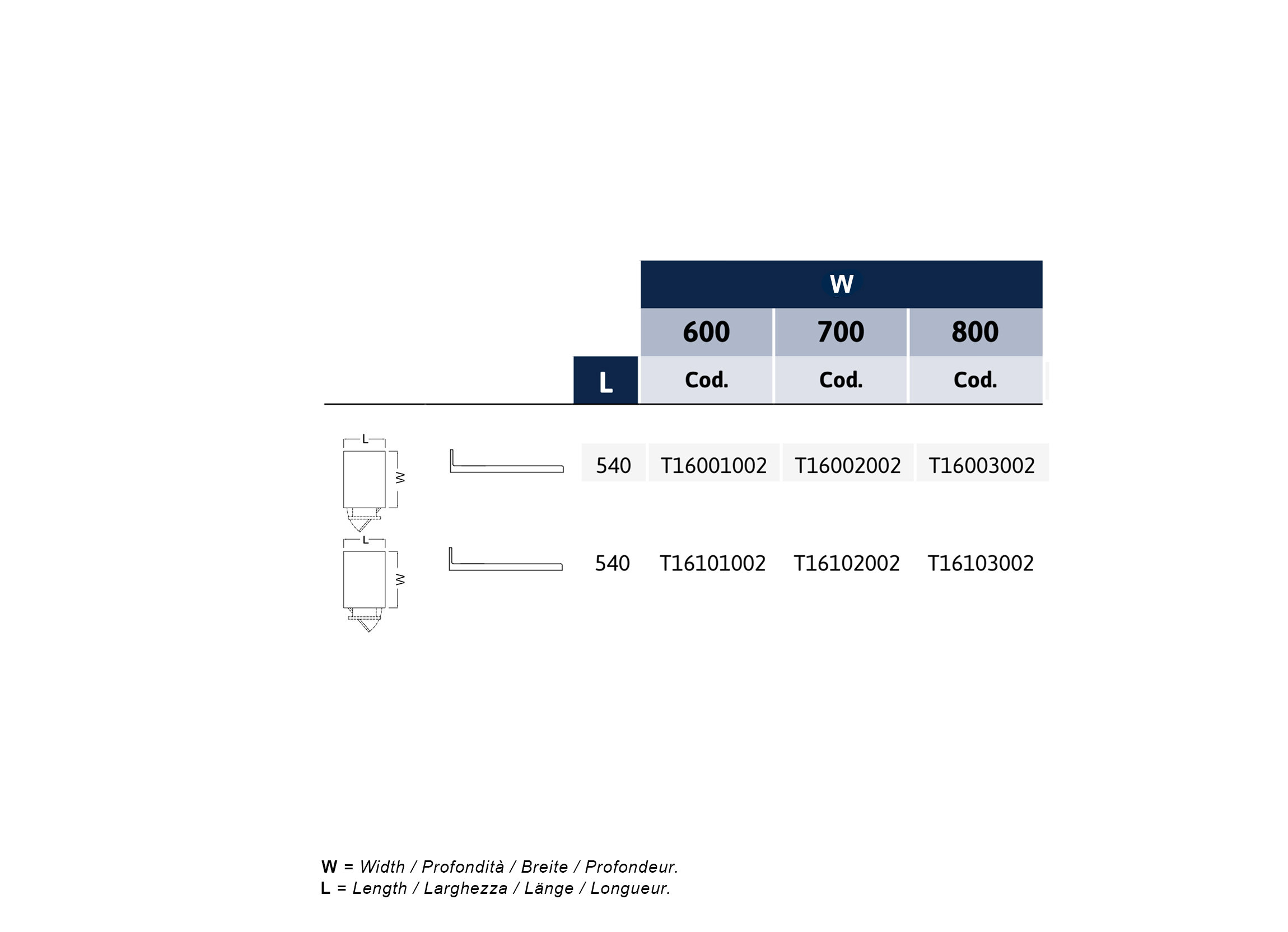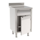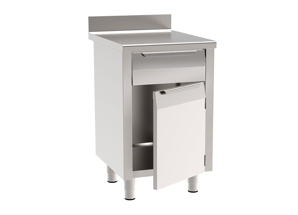 welded and closed on the back, and with R=10mm rounded lower edge. Full extraction drawer mounted on stainless steel rails. Hinged door mounted on removable hinges. On stainless steel telescopic feet, the rear ones advanced for rounded floor.