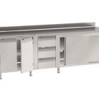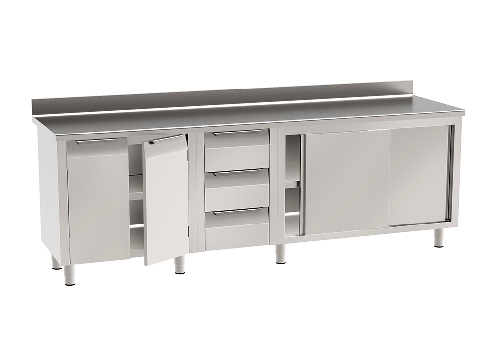 Manufactured in stainless steel AISI 304. Working top in AISI 304 sheet, 1.20mm thick, with inner plywood reinforcement and stainless steel lower cover. Rounded (R=10mm) front upper edge, as well as rounded (R=2mm) side and back edges. Optional rear stainless steel upstand H=100mm, welded and closed on the back, and with R=10mm rounded lower edge. Hinged doors mounted on removable hinges, and with internal adjustable shelf. With central 3-drawer unit on stainless steel rails. Sliding doors mounted on hygienic rails, easily removable without mechanical tools, equipped with Internal adjustable shelf. On stainless steel telescopic feet, the rear ones advanced for rounded floor.