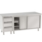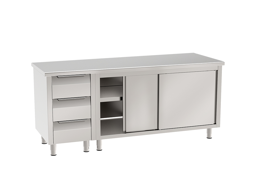 welded and closed on the back, and with R=10mm rounded lower edge. Sliding doors mounted on hygienic rails, easily removable without mechanical tools, and with internal adjustable shelf. With 3-drawer unit on stainless steel rails. On stainless steel telescopic feet, the rear ones advanced for rounded floor.